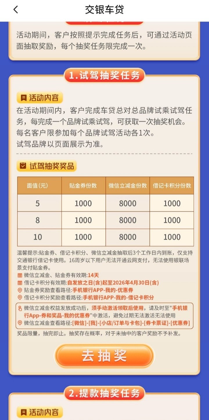 有交通银行的哥们可以去APP上搜索“交银车贷”进去预约试驾有两次抽奖机会可以得立减金